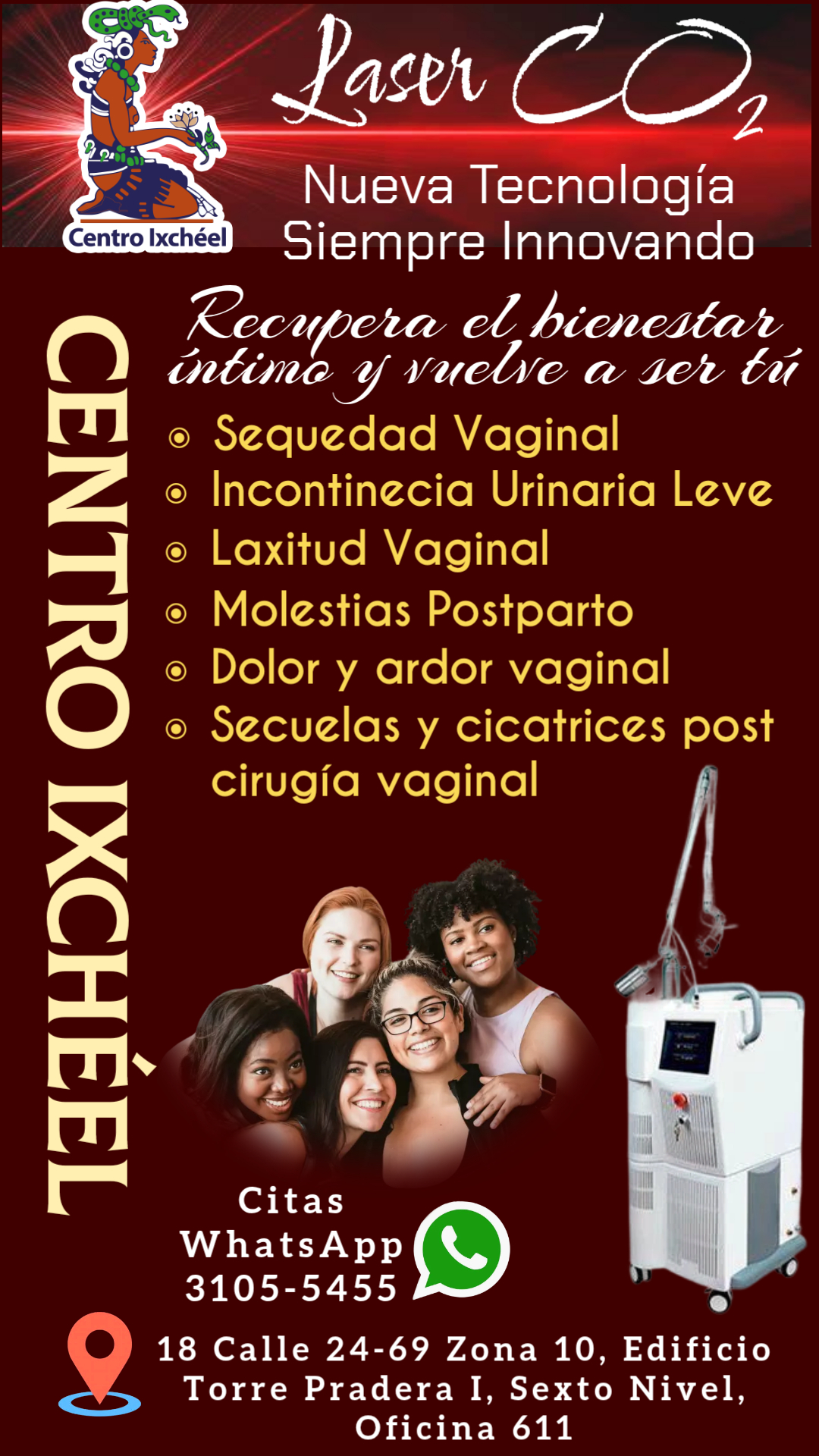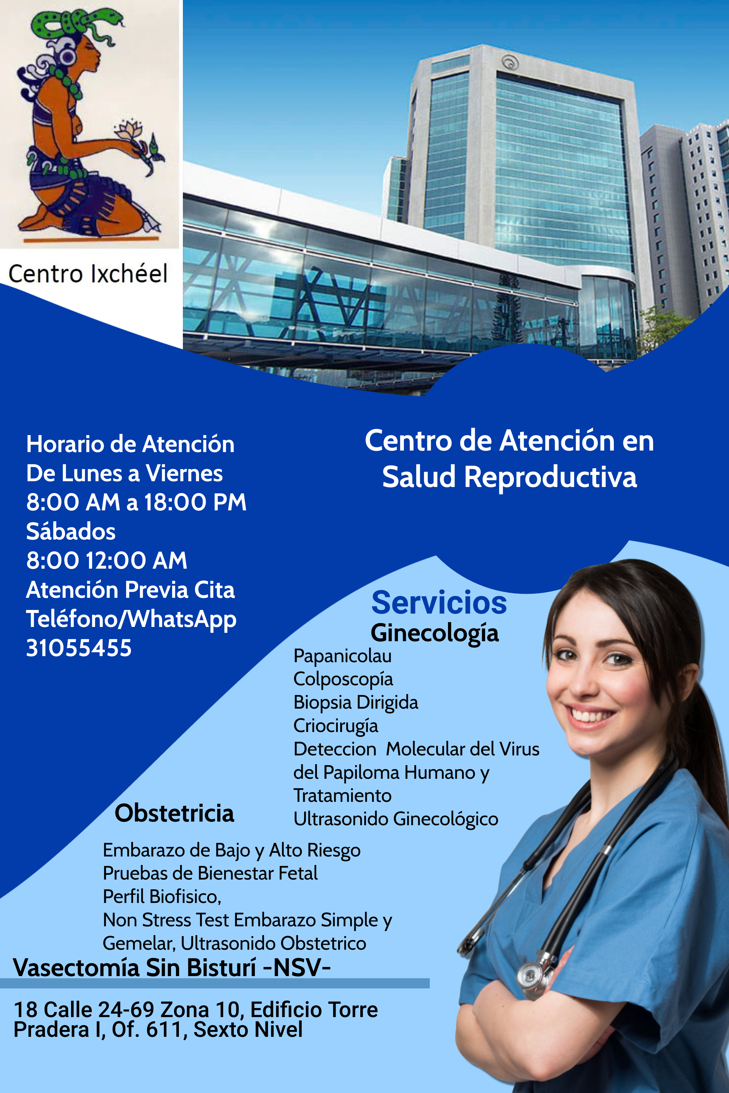 El «Centro Ixchéel en Atención en Salud Reproductiva» cuenta con alrededor de 80 metros cuadrados de área física y la suficiente tecnología de vanguardia para brindar atención Integral en Salud Reproductiva en Ginecología y Obstetricia, Patología Cervical; Papanicolau, Colposcopia, Criocirugía, Electrocirugía, Tratamiento Moderno e Integral del Papiloma Virus, Vacunas Contra el Papilomavirus, Tratamiento de Infecciones Vaginales, Pruebas de Bienestar Fetal; Perfil Biofísico, -NST-, Ultrasonido Ginecológico y Obstétrico, con las más modernas instalaciones y equipo para brindar atención de calidad y soluciones integrales para la salud, llevando el proceso de atención a otro nivel y accesible económicamente a toda la población.